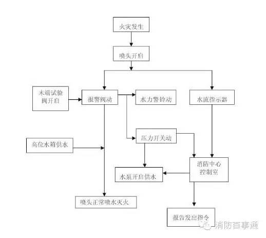 當(dāng)自動(dòng)噴淋滅火系統(tǒng)的保護(hù)區(qū)域內(nèi)發(fā)生火情時(shí),火場(chǎng)環(huán)境溫度升高,閉式噴頭上的玻璃球破裂(或易熔合金熔化),噴頭打開(kāi)噴水滅火。此時(shí)由于濕式報(bào)警閥出口側(cè)管網(wǎng)水壓下降,形成壓差,閥瓣組件打開(kāi),供水側(cè)水源水不斷補(bǔ)充管網(wǎng)滅火,同時(shí)水流也經(jīng)密封環(huán)槽內(nèi)的孔流入延遲器,并迅速充滿,以一定水壓沖擊水力警鈴發(fā)出連續(xù)的報(bào)警聲,壓力開(kāi)關(guān)動(dòng)作接通電觸點(diǎn),并將信號(hào)反饋至控制中心,以聲、光報(bào)警,同時(shí)啟動(dòng)主供水泵進(jìn)行消防滅火。